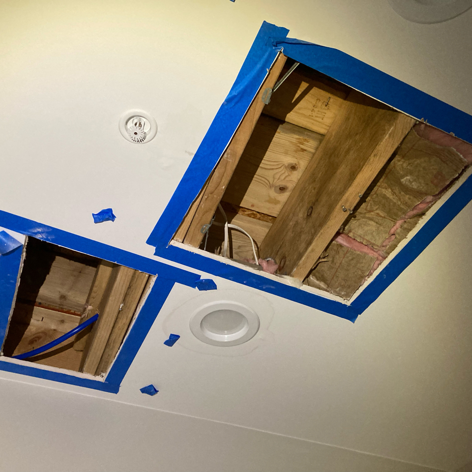 The Leak: In June of 2022, Philadelphia homeowner Erica discovered multiple leaks throughout the third floor of her newly constructed home. Water damaged the ceilings above the landing, in the bathroom, and above the staircase. It also began leaking into her bathroom walls.