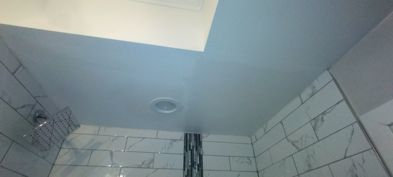 On Erica’s cue, our cosmetic repair team made a plan with one goal in mind: making the house like new again. We began by taping and plastering the seams of the ceiling panels in both the second-floor hallway and the bathroom. The largest repair, however, was in the hallway. We needed to replace the drywall of the entire ceiling, along with taping, plastering, and caulking. After everything dried, our team repainted each area and reinstalled the ceiling lights.