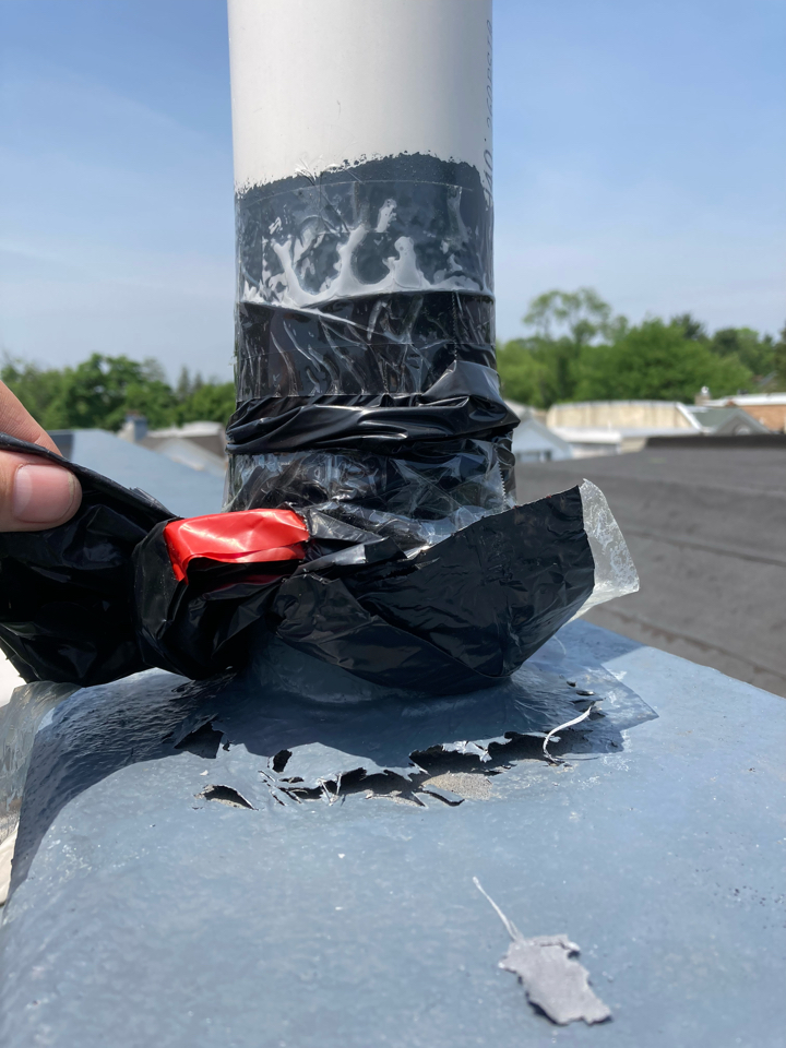 For the bathroom leak, we needed to repair the PVC pipe on the roof. We began by reducing the height of the pipe to strengthen it against the wind. This created less risk of future fiberglass separation. Next, we began repairing the PVC pipe’s base, and the vertical cracks on the inside and outside edge of the parapet wall cap. Finally, we added an EPDM rubber membrane patch to the cracked fiberglass under the rug.