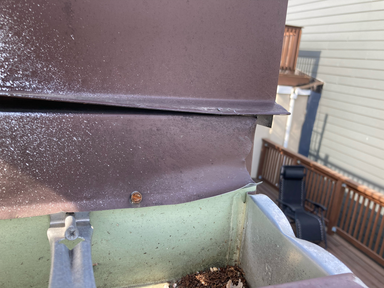 We could clearly see visible water damage around the ceiling, bump out, and wall corner. Above it was the edge of the roof deck with a gutter and drain box. The membrane was in good shape, but there was a large, visible opening between the gutter and the metal flashing of the deck. There were also two vents on the rear stucco façade that had visible gaps around them. Suspecting that these gaps may be the issue, we went back inside to investigate further.