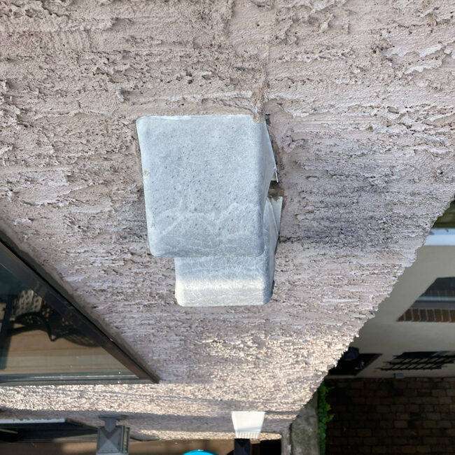 Because being thorough is the name of the game with leaks, we then explored the rest of the area to see if water was coming in from any other sources. We tested several areas around the membrane and under the support joists at the corner of the deck extensively, but didn’t see any leaks. We then tested the corner, where the metal capping was slightly bent and not making proper contact with the stucco. After about 10 minutes testing, water slowly started to come in through the top and bottom of the joist inside.